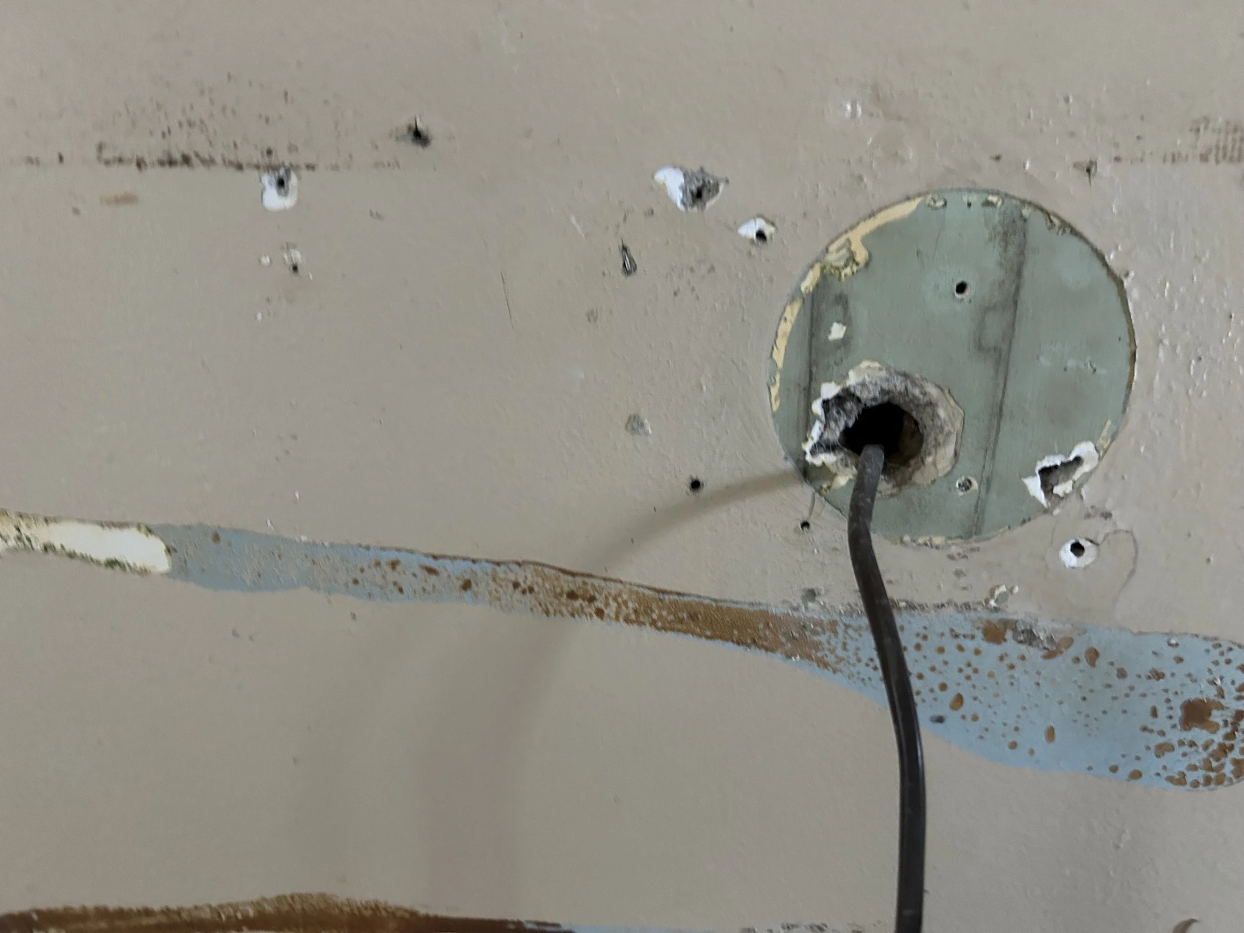 Right: Kitchen wall, revealed under removed panelling. There are four distinct paint colors/layers visible.