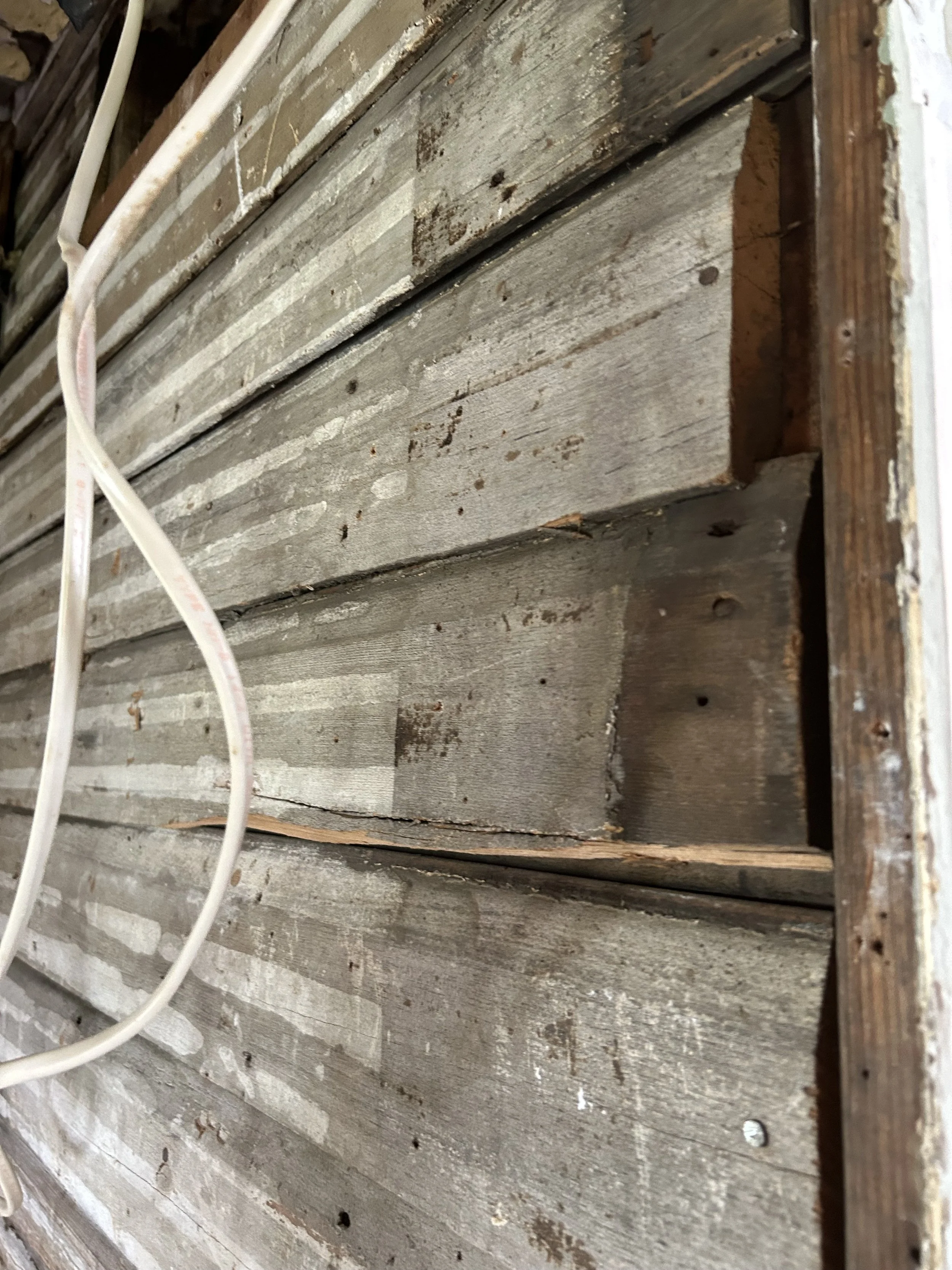 Left: Wood siding on the old exterior wall, now the bathroom - left of door.