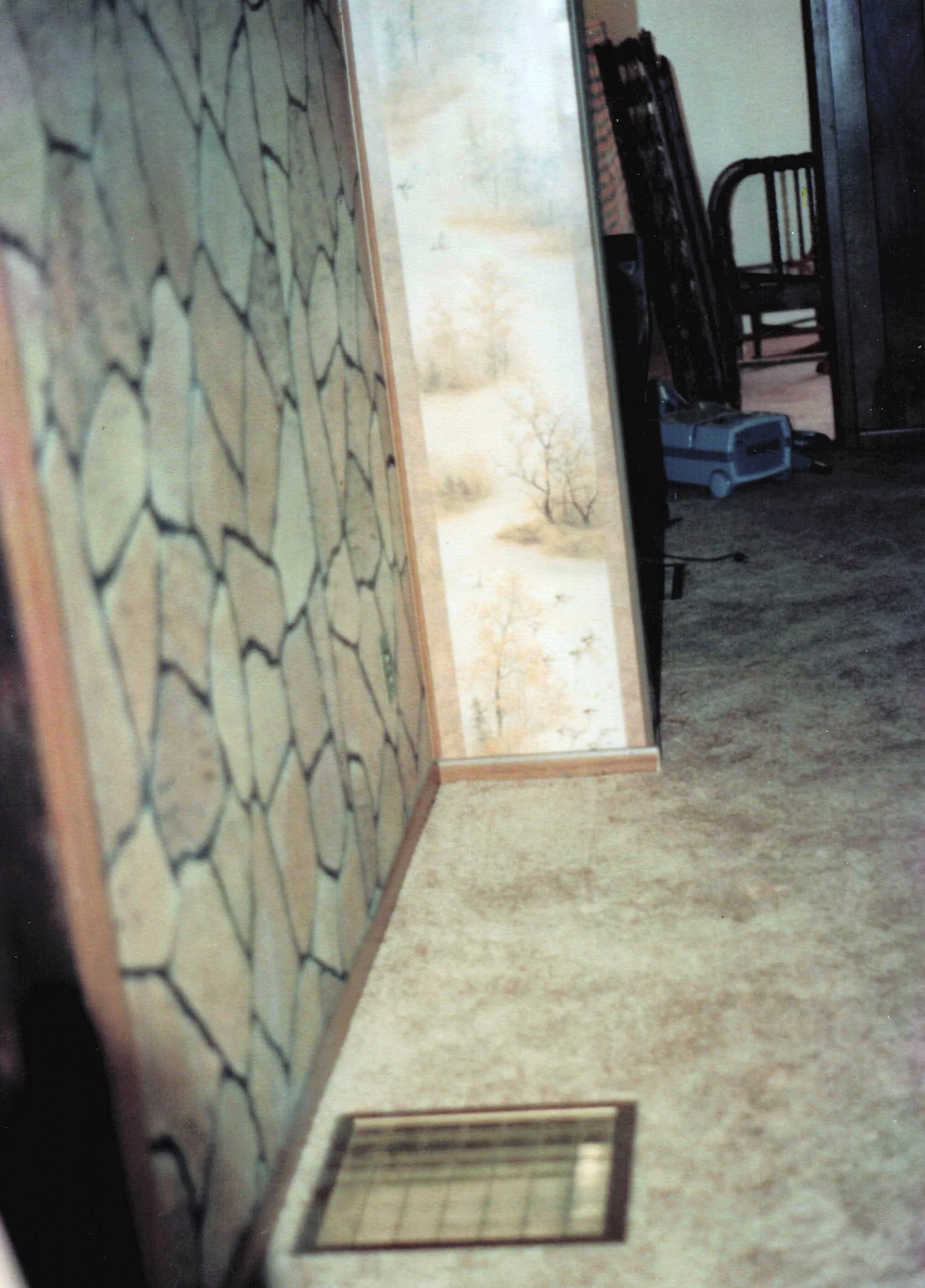 Among the things left behind when we took possession, we found a box of old photos from when my grandparents first fixed things up during the late 80s (you can see the entire gallery here) that helped me piece together a few things. For instance, I did not remember that the hall closet and library shelves were things they had added. I also had long since forgotten that I “helped” with the installation of the bay window that my grandmother loved so much. The display case that we removed from the living room had originally been a window back when the front room was still a porch, was turned into a small inset shelf, until finally Grandpa turned it into a glass display case for his toy JD tractors in the mid-late 90s. And yes, I do in fact have a faint memory of the lovely stone and countryside panelling in the living room.